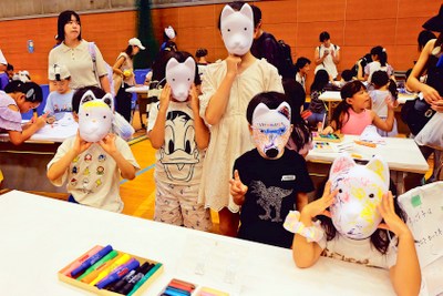 お面を作るコーナーではキツネのお面に好みの彩色をしてオリジナルのものに仕上げていく。