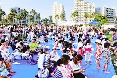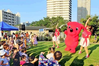 夕方には人気の明海よさこい連が登場。大きな旗を振って、迫力ある演舞を披露する。その後、参加者そろって盆踊りを楽しみ、終了する。