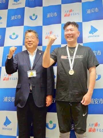 令和7年6月に行われた2025ジャパンパラ陸上競技大会のMenT42・100m部門で金メダルを獲得した浦安市在住の木名瀨大介選手が7月4日、市役所を訪問。内田悦嗣市長に報告した。