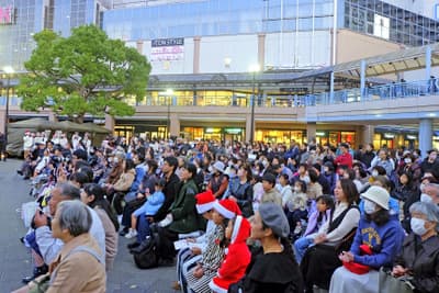午後5時、駅前広場の樹木などに設置されたイルミネーションが一斉に点灯され、会場から歓声がわき起こった。