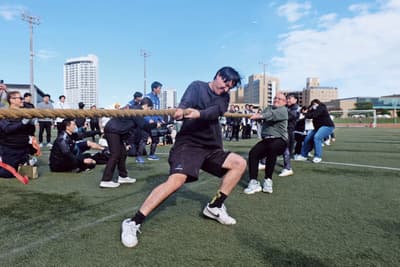 いちよし証券浦安支店のチームはそろいのハッピ姿で登場した。豊川祐司支店長は「社員に呼び掛けて参加した。綱引きは本気になる。気持ちいい」と語った。