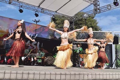 4日は小雨模様だったが、屋内の市民プラザの会場には多くの市民が集まった。ステージでは華麗な衣装をまとった女性たちが音楽に合わせ、フラダンスを披露した。